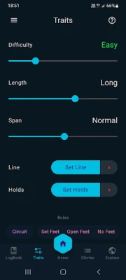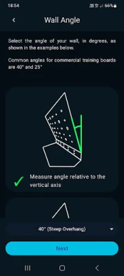 Pievienot savu sienu ir vienkārši, pateicoties interaktīvajai vedņa procedūrai, kas soli pa solim palīdzēs jums konfigurēt katru detaļu – sākot no sienas attēla un izmēriem, līdz pat satvērienu pozīcijām un to grūtības novērtējumam. Šis process aizņems aptuveni 5-10 minūtes un jāveic tikai vienu reizi jaunai sienai. Pēc tam visas funkcijas, piemēram, problēmu ģenerēšana vai manuāla izveide, ir tūlītējas un neprasa papildu sagatavošanos. Lietotne atbalsta dažāda veida mājas kāpšanas sienas – tai skaitā spray walls, woodies un treniņu dēļus, kas ir pārsvarā līdzenas virsmas. Pats labākais? Tā darbojas pilnīgi bezsaistē, visus jūsu datus droši glabājot ierīces iekšējā atmiņā.