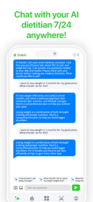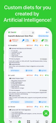 DietAI ir jūsu personīgais, visaptverošais veselības kompanjons, kas pārsniedz ierastu kaloriju skaitītāju funkcijas. Tas ir inteliģents uztura izsekošanas rīks, kas izstrādāts, lai efektīvi virzītu jūs pretī jūsu labsajūtas un fitnesa mērķiem. Vai jūsu mērķis ir svara samazināšana, muskuļu masas palielināšana vai vienkārši veselīga dzīvesveida uzturēšana, DietAI pielāgojas jūsu individuālajām vajadzībām, piedāvājot personalizētus diētas plānus. Ar mūsu jaudīgo mākslīgā intelekta (AI) ēdienu dienasgrāmatu un plānotāju, kaloriju, makroelementu un citu būtisko barības vielu uzskaite kļūst pilnīgi bez piepūles.