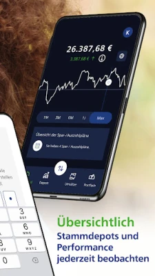 Šī mobilā platforma sniedz jums pilnīgu pārskatu par katru galveno depozītu, tā veiktspēju un visiem aktīvajiem uzkrājumu vai izņemšanas plāniem. Viegli pārvietojieties starp dažādiem galvenajiem depozītiem un detalizēti aplūkojiet to sastāvā esošos apakšdepozītus ar vizuālu vērtības attīstību. Apakšdepozīti ir skaidri marķēti atbilstoši to kategorijām, piemēram, Riester iemaksas, uzkrājumu plāni, izņemšanas plāni un ar darbu saistīti iemaksas, nodrošinot izpratni par katra ieguldījuma mērķi. Lietotne atvieglo jaunu pirkumu veikšanu, ieskaitot regulāru uzkrājumu plānu izveidi vai vienreizējus ieguldījumus, kā arī vienkāršo pārdošanas darījumu izpildi.