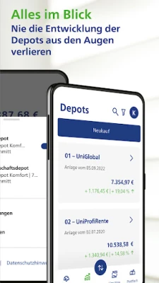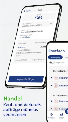 Pārvaldiet savus UnionDepotOnline kontus, sekojiet līdzi ieguldījumu attīstībai un plāniem. Veiciet fondu vienību pirkšanas un pārdošanas darījumus jebkurā laikā. Saņemiet svarīgas ziņas un piekļūstiet dokumentiem jaunajā pastkastē. Sazinieties ar klientu atbalstu tieši no lietotnes.