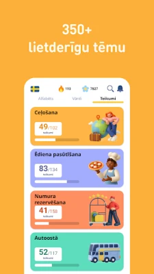 "FunEasyLearn" saturs ir rūpīgi strukturēts, lai nodrošinātu visaptverošu mācību pieredzi. Lietotnē atradīsiet plašu vārdu krājumu, kas ietver vairāk nekā 6000 biežāk lietotos zviedru valodas vārdus, sākot no pamata lietvārdiem līdz sarežģītiem darbības vārdiem, kas sadalīti 7 līmeņos un 200 tematiskās sadaļās. Turklāt ir pieejamas 5000 praktiskas frāzes, kas noderēs gan ikdienas saziņā, gan ceļojumos, sakārtotas 10 līmeņos un 120 tēmās. Šis bagātīgais materiāls ir pielāgots visu līmeņu apguvējiem – no iesācējiem līdz pieredzējušiem runātājiem.